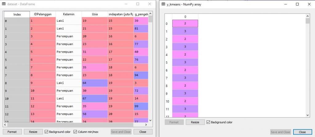 kalau tabel basil clustring (y_means) bisa? maaf banya tanya baru belajar? saya coba pake algoritma r sudah bisa cuman install spyder ada error saya ga tau kenapa jadi saya masih penasaran