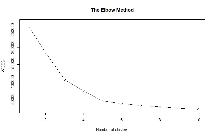 wcss[i] = sum(kmeans(dataset, i)$withinss)