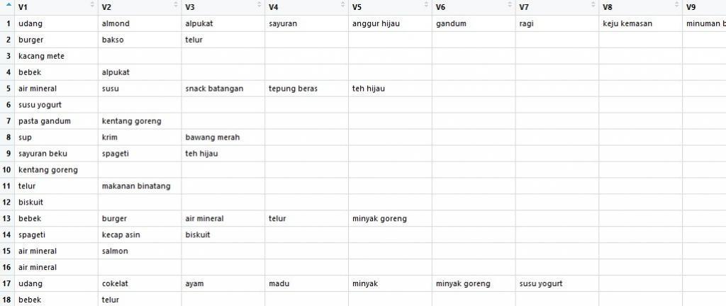 - Line 6 mengimpor datasetnya. Kita set header = FALSE agar kolom paling atas di dataset bukanlah barang belanjaan yang dibeli, melainkan hanya kolom kosong. Jika sudah coba klik 2x pada dataset, maka tampilannya sebagai berikut: