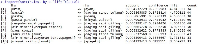 - Line 15 adalah melihat hubungan apriori yang dihasilkan. Kita urutkan berdasarkan nilai lift-nya. Hasilnya tampak sebagai berikut: