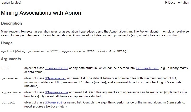 - Line 12 adalah perintah untuk mentraining datasetnya dan mengaplikasi algoritma apriori. Kita definisikan variabel rules untuk modelnya, dan kita gunakan perintah apriori (dari package arules). Untuk melihat parameter apa saja yang diperlukan, cukup arahkan kursor ke apriori dan ketik F1 di keyboard, maka tampilannya sebagai berikut: