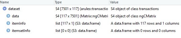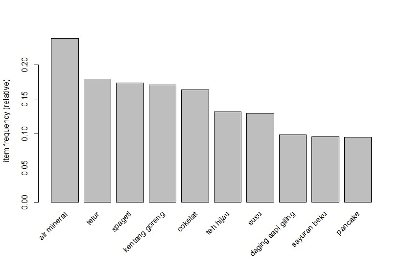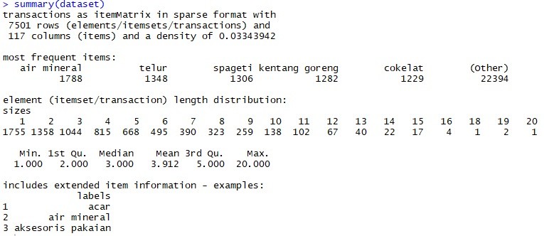 Bisa dilihat dari tampilan di atas bahwa kita memiliki 7501 baris dan 117 kolom. berarti ada 7501 transaksi dan 117 item-item yang dibeli. Density yang dimiliki adalah 0.033 (3%) yang artinya proporsi itemnya kosong adalah 3%. Kemudian kita melihat frekuensi item yang dibeli, yang tertinggi adalah air mineral, diikuti telur, dan seterusnya.