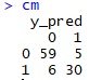 - Line 28 mendefinisikan variabel cm untk membandingkan antara test set (data asli) dengan y_pred (data hasil prediksi). Hasil cm akan tampak sebagai berikut: