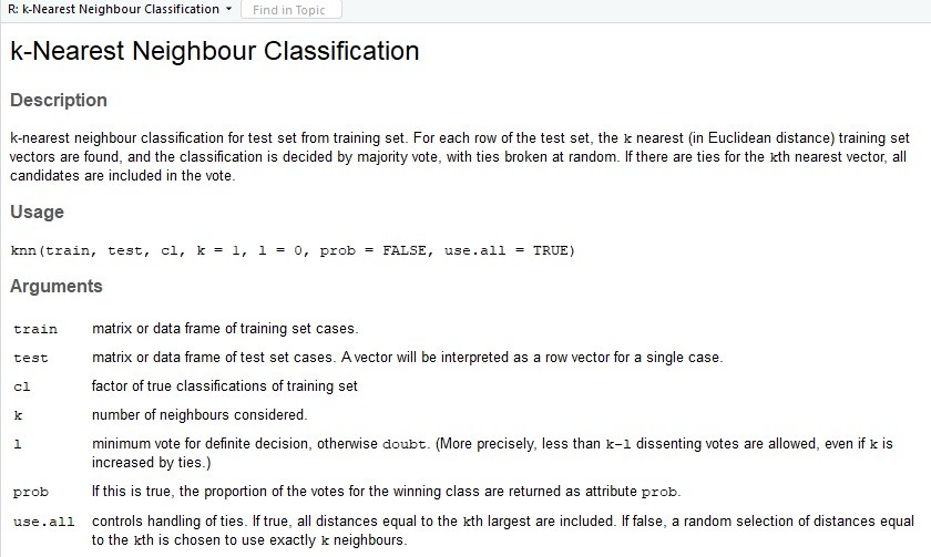 - Line 22-26 membuat model k-NN sekaligus memprediksi y_pred dari model ini. Untuk memudahkan mengetahui parameter apa saja yang diperlukan maka cukup arahkan kursor ke knn, lalu ketik F1 di keyboard. Maka tampilannya akan seperti ini: