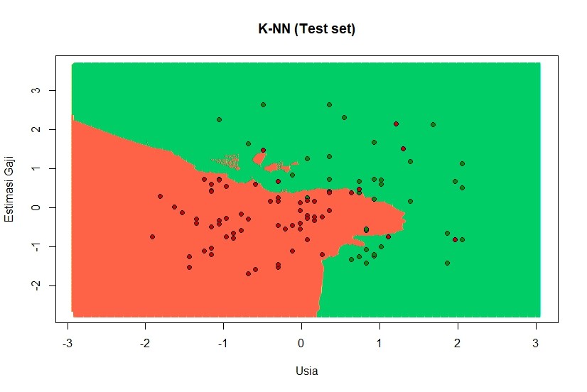 - Line 31-44 adalah visualisasi hasil model k-NN terhadap training set. Pastikan library ElemStatLearn sudah terinstall di Rstudio. Hasilnya akan tampak sebagai berikut: